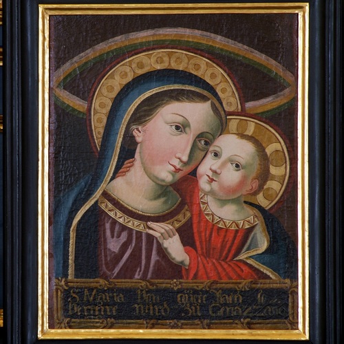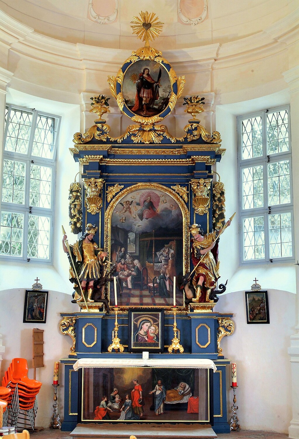 Das Altarbild des linken Seitenaltars ist eine Darstellung der Geburt Mariens, am Aufsatzbild ist der hl. Johannes zu erkennen. Die Statuen sind Bildnisse des hl. Eustachius und des hl. Georgs.