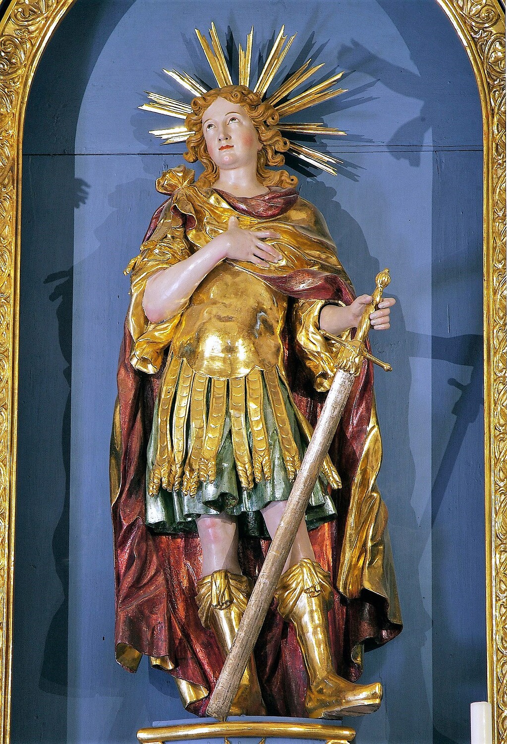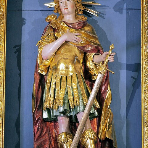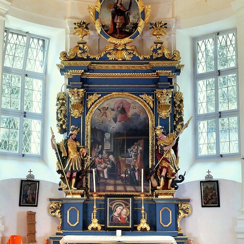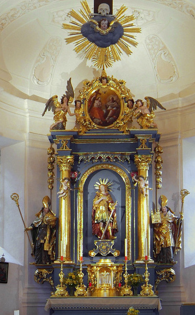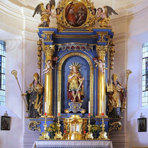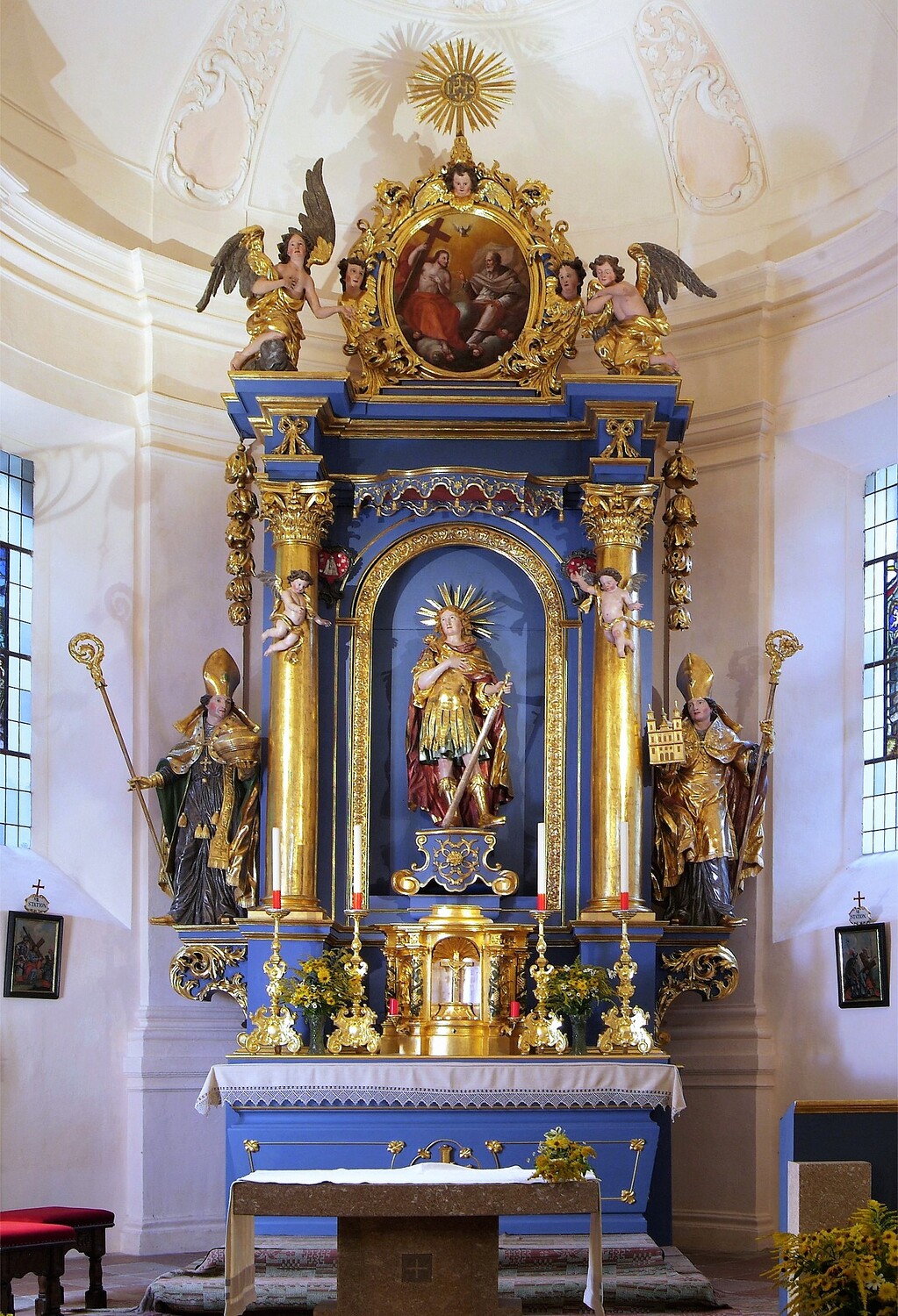In der Mittelnische des Hauptaltares befindet sich auf einem verzierten Postament die Statue des hl. Pankraz, eines jungen, römischen Kriegers mit einem Schwert. Auf den seitlichen Konsolen die Statuen des hl. Rupert und des hl. Virgil. Das Aufsatzbild stellt die Heilige Dreifaltigkeit dar.